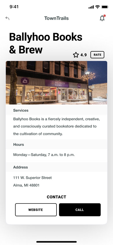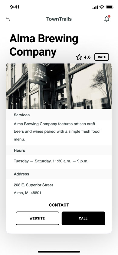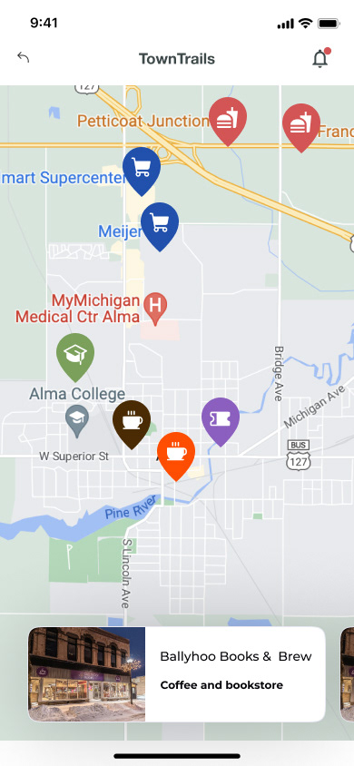 An Alma College Enrichment App, which would incentivize the use of ATC by connecting students to local businesses and resources within the community. We have created a prototype of the app using Figma. After the user logs in, they are brought to a homepage with an interactive map. The map is filtered into categories including food, entertainment, errands, coffee, and campus locations, and displays the areas accessible by the transit center. Users can click on any location to obtain information about its services, visit its website, call, or rate the service. Additionally, the home screen provides more details about the transit center and allows users to schedule a ride directly through the app.