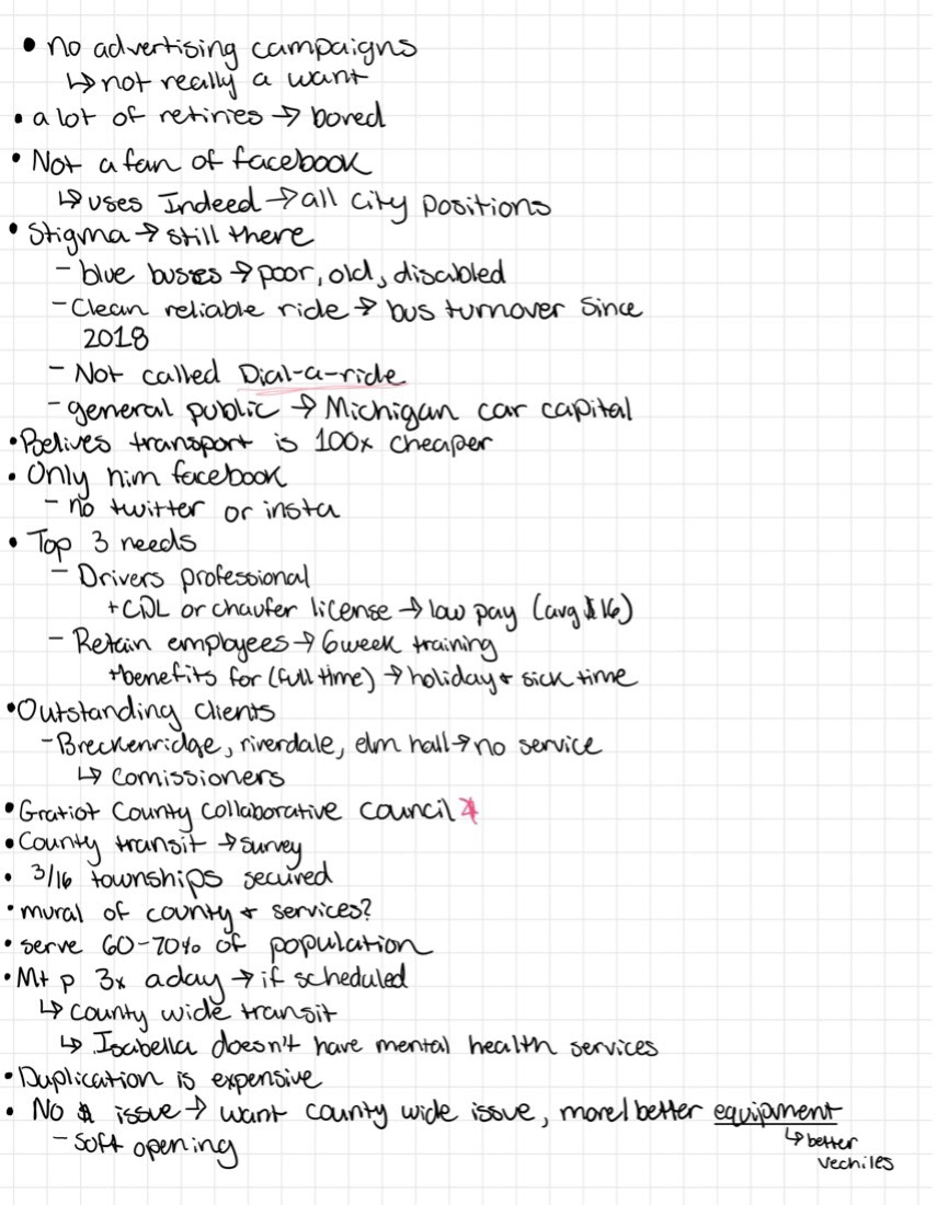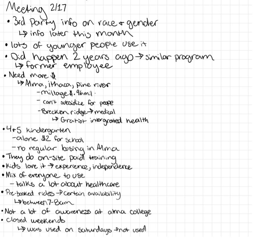 We are partnering with the Alma Transit Center and Alma College. The Transit Center is responsible for providing safe and accessible transportation for students free of charge. While ATC provides the transportation and Alma College funds it, we would then strengthen the link between the two, outlining the locations to which students can travel using the service.