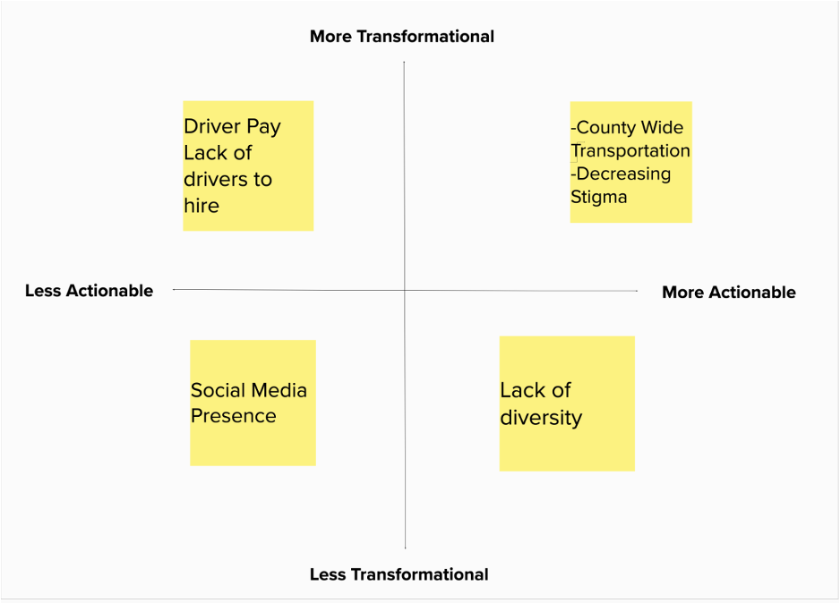 After we had gathered information from the ATC, our next steps are to ask questions to the users and the drivers, and form a user purpose statement, and then narrow down our focus and problem statement. We created a survey for students and sent it out campus-wide, and analyzed their responses.